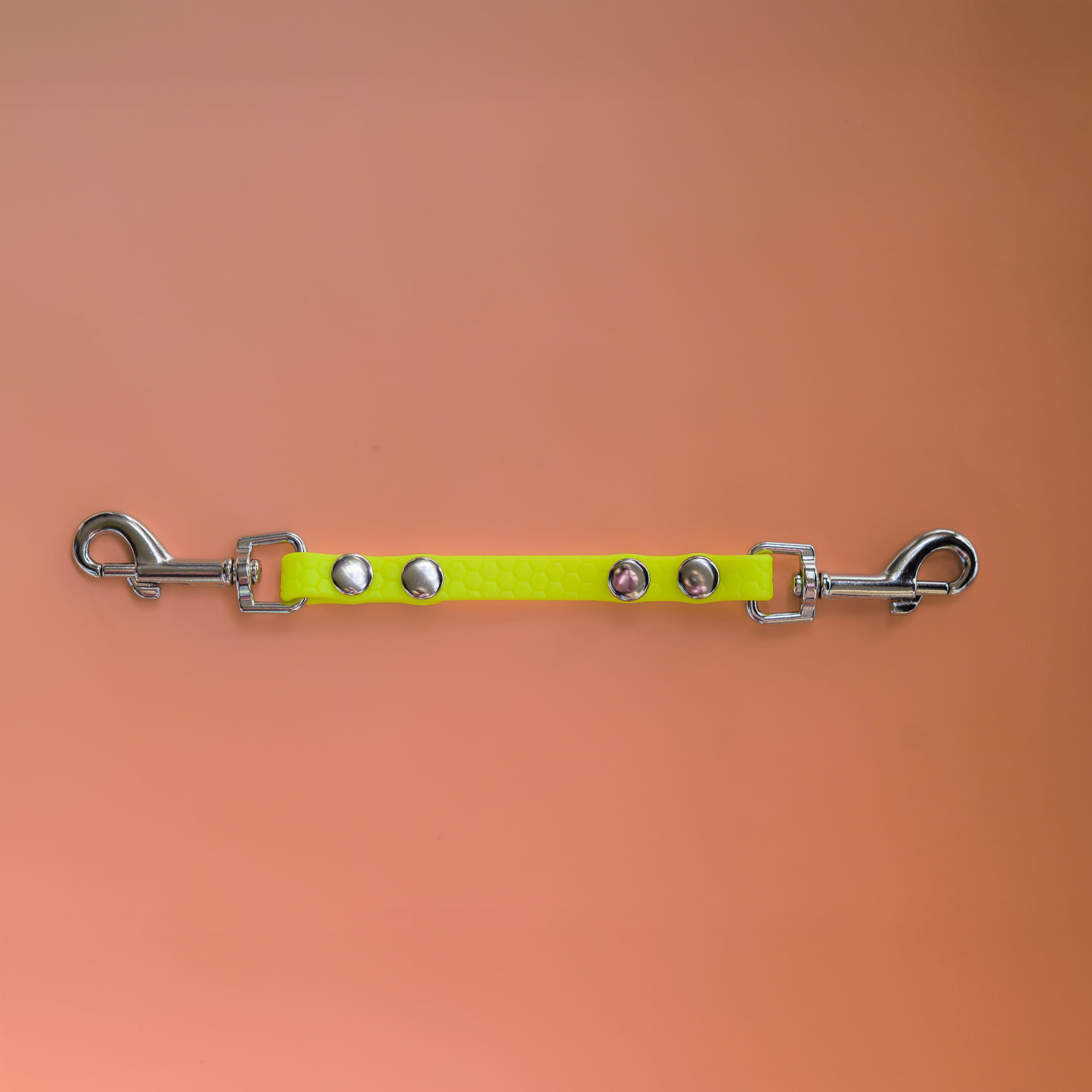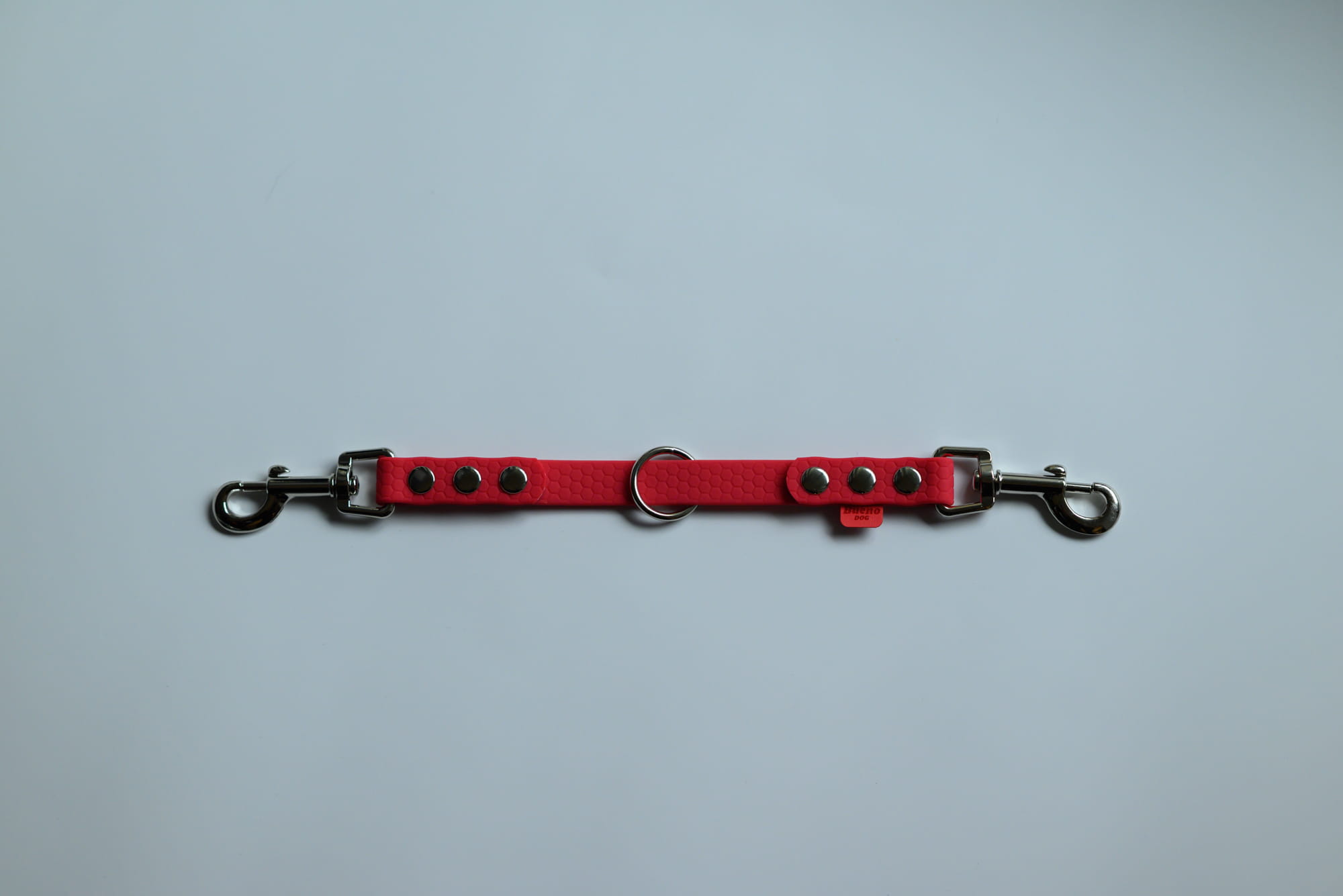 Łącznik bezpieczeństwa 13 mm – uniwersalny wybór do spięcia obroży z szelkami albo dwóch obroży. Wodoodporna taśma PVC/TPU (hexa lub gładka), na wymiar, karabińczyki do wyboru. Najlepszy „złoty środek” dla małych–średnich psów.l