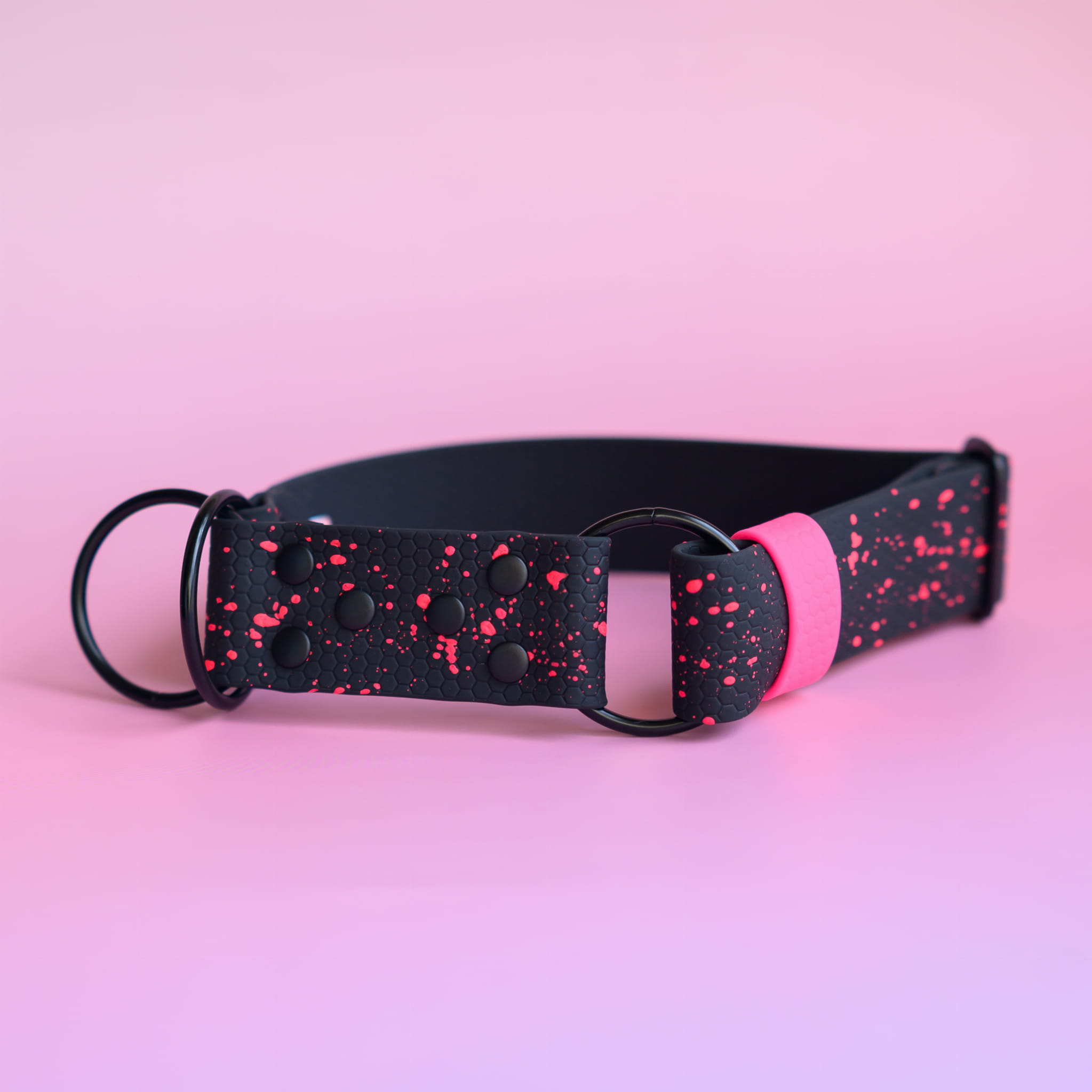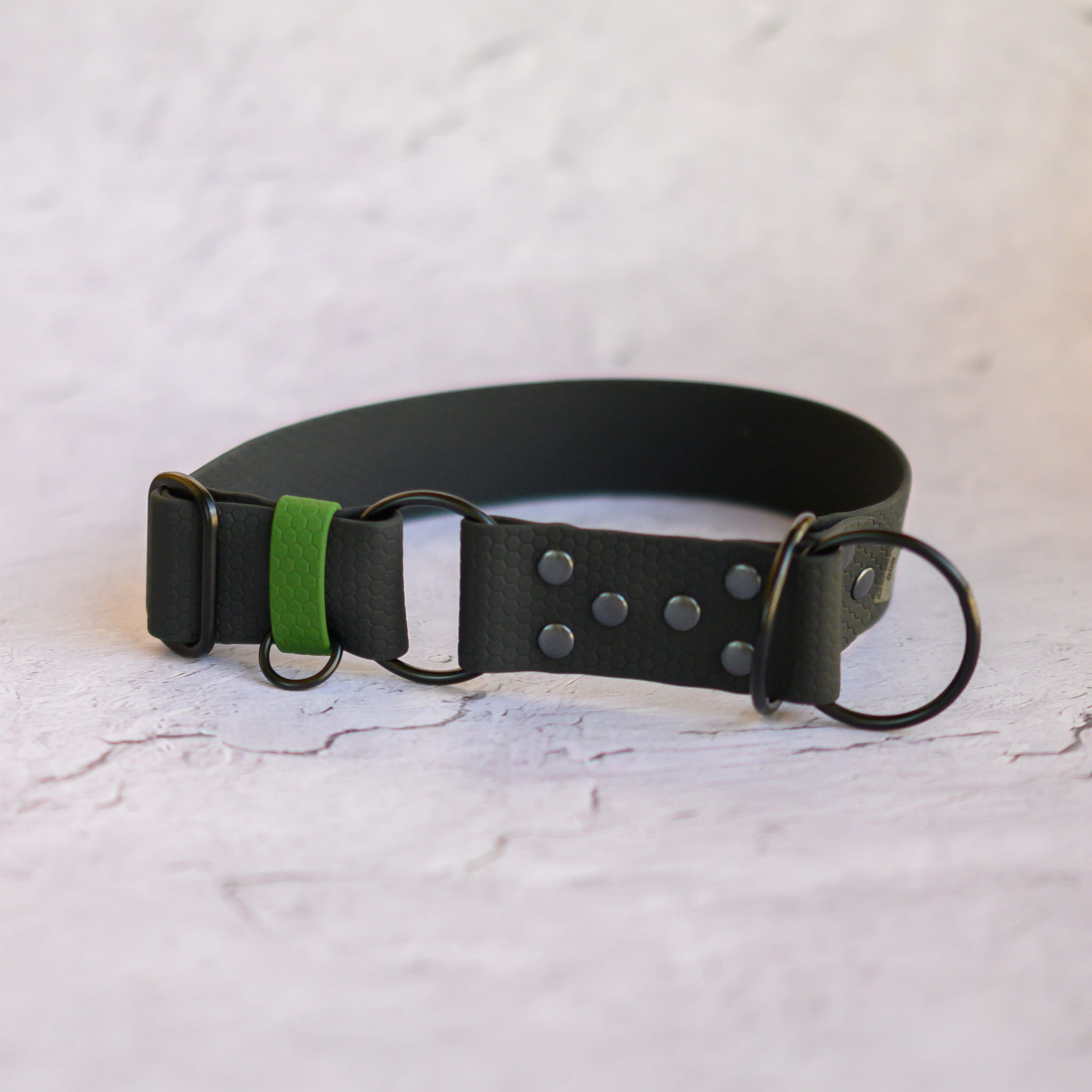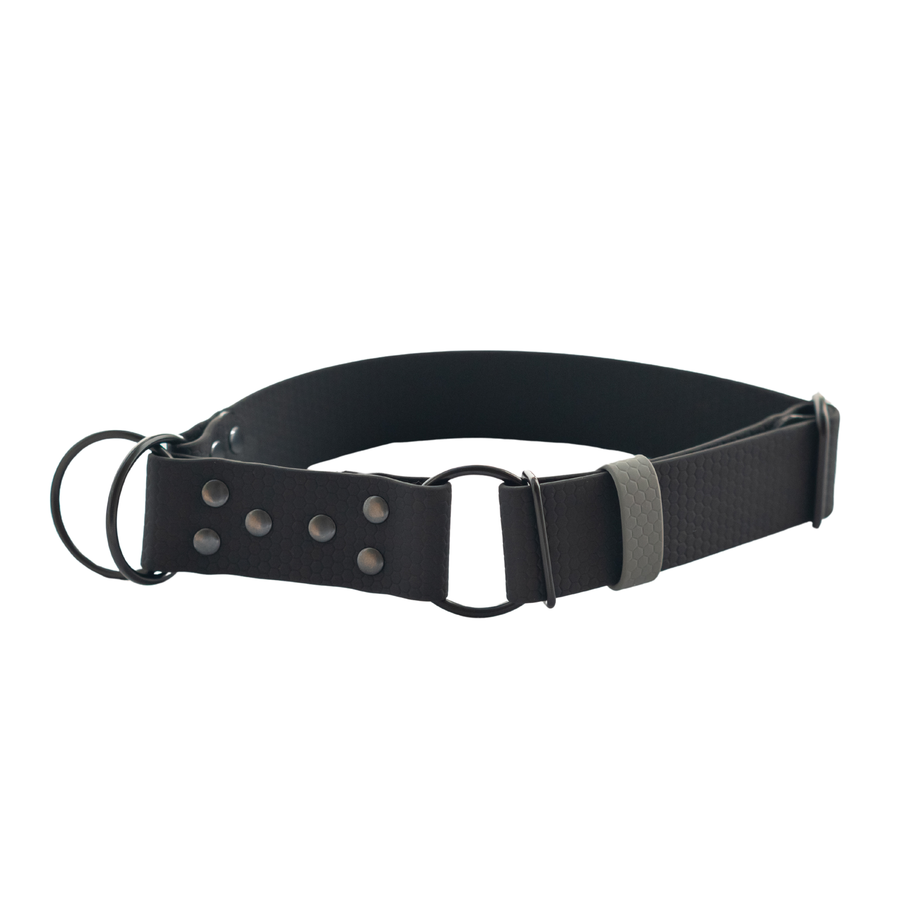 Ręcznie robiona obroża półzaciskowa 40 mm (4 cm), tworzona na wymiar we Wrocławiu. Wodoodporna taśma PVC/TPU (czarna i pomarańczowa hexa plaster miodu lub czarna taśma smooth), dla dużych psów, łatwa w czyszczeniu. Opcjonalnie: SPLASH, adresówka z grawerem i dodatki.