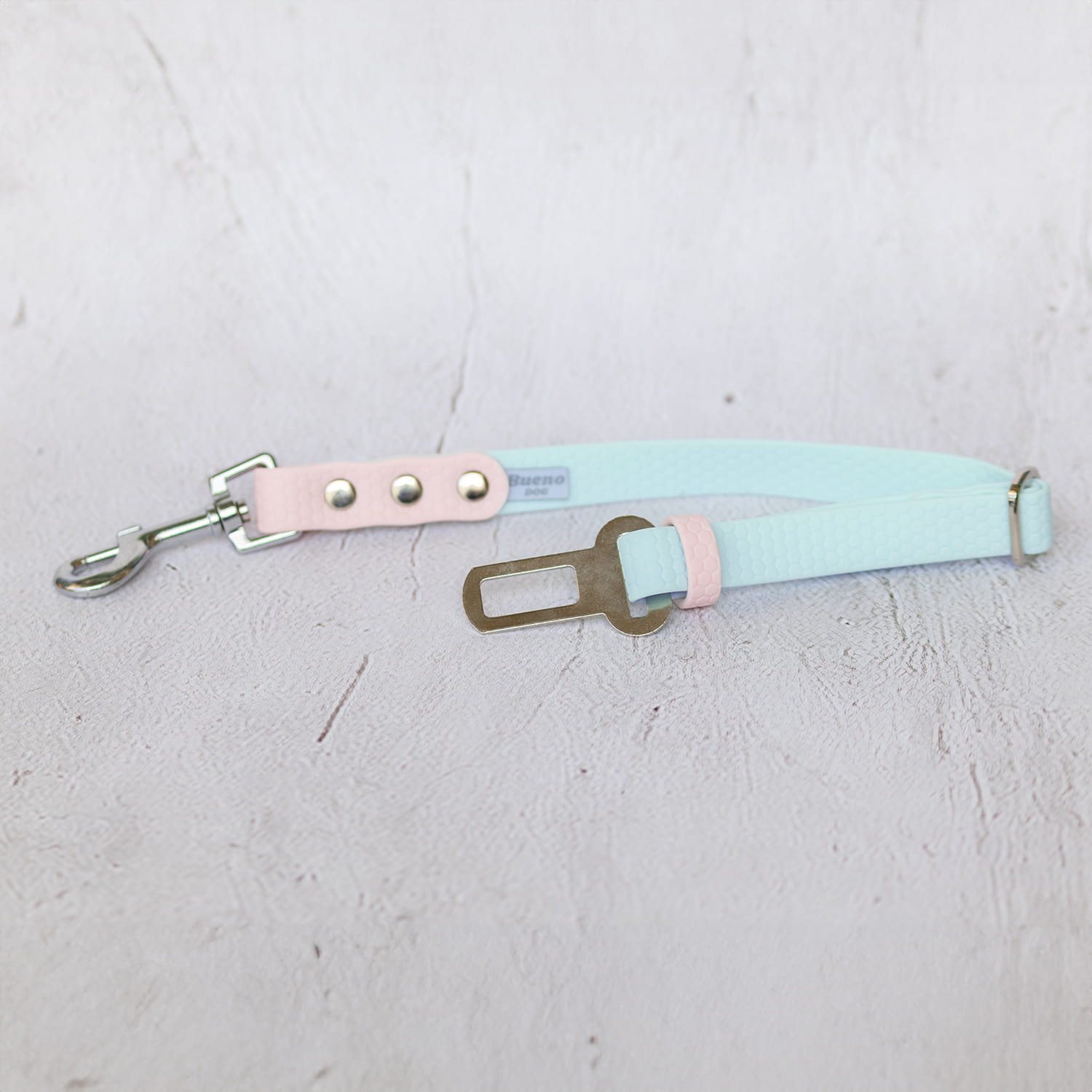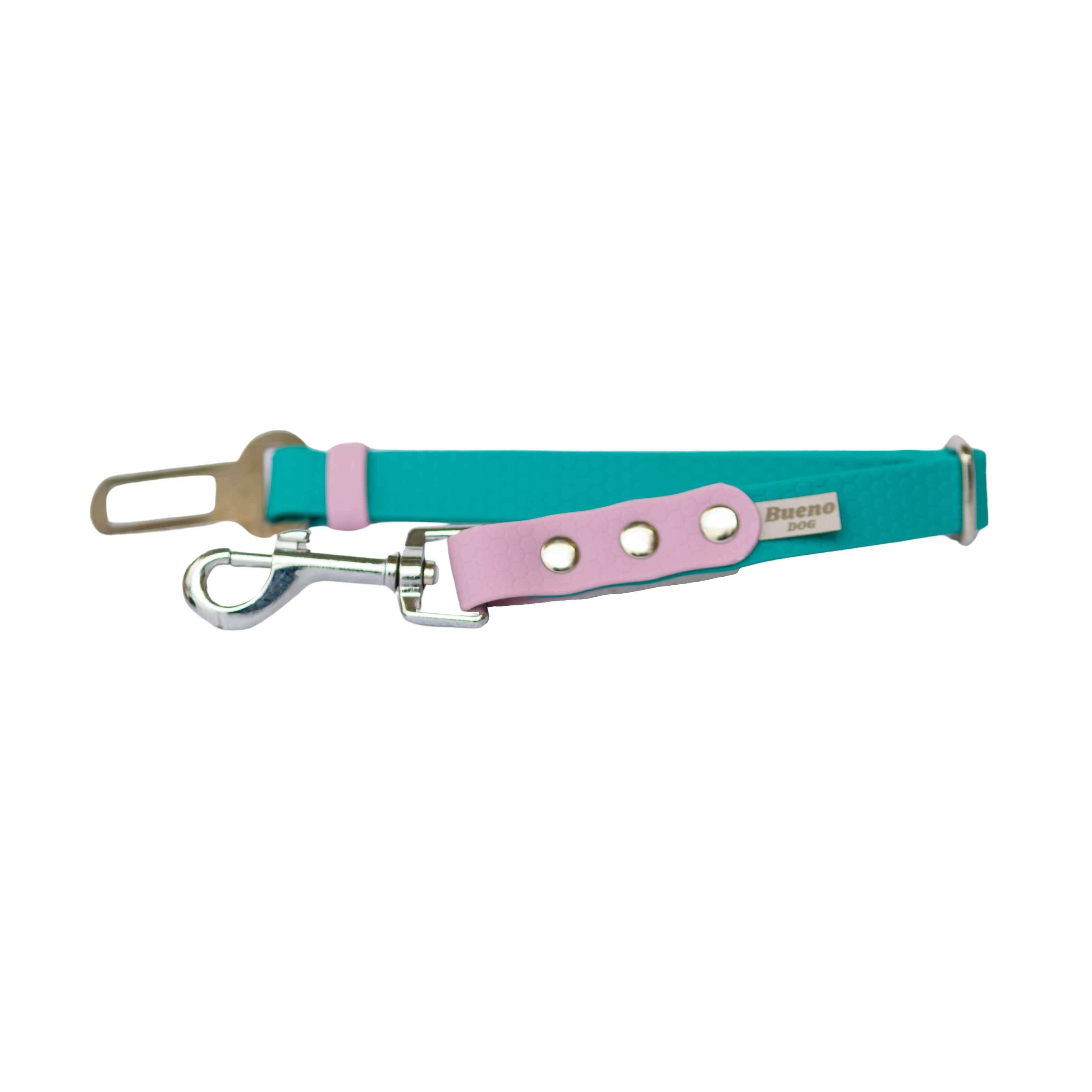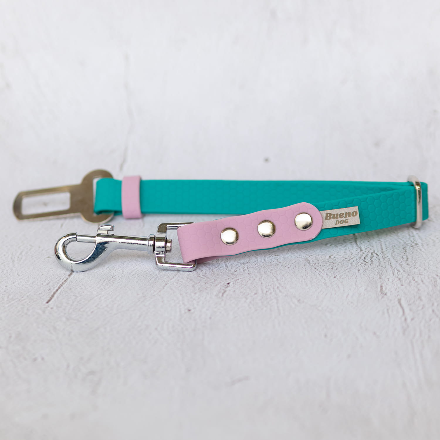 Regulowany pas samochodowy dla psa Bueno DOG (pas bezpieczeństwa / smycz samochodowa do auta) w 2 systemach montażu: do klamry pasa lub do zagłówka (klamra zatrzaskowa albo karabińczyk). Pomaga utrzymać psa na miejscu w aucie i ogranicza ryzyko „lotu do przodu” przy hamowaniu. Taśmy PVC/TPU: smooth oraz hexa plaster miodu.