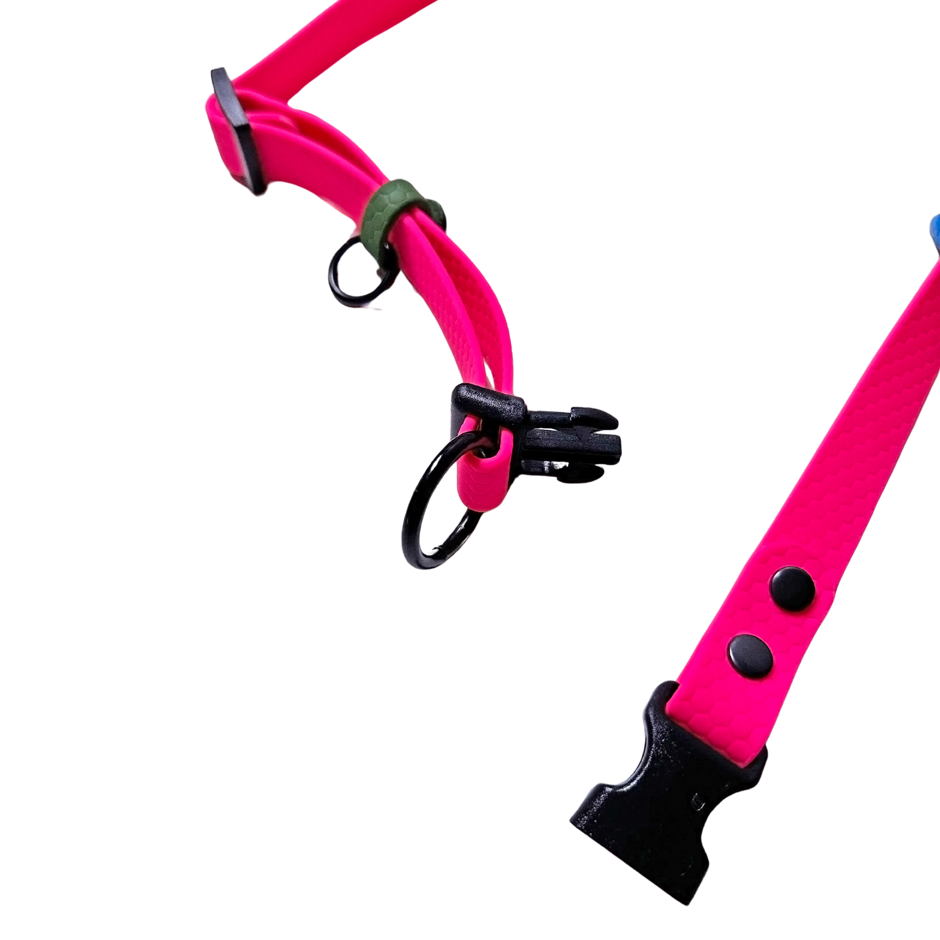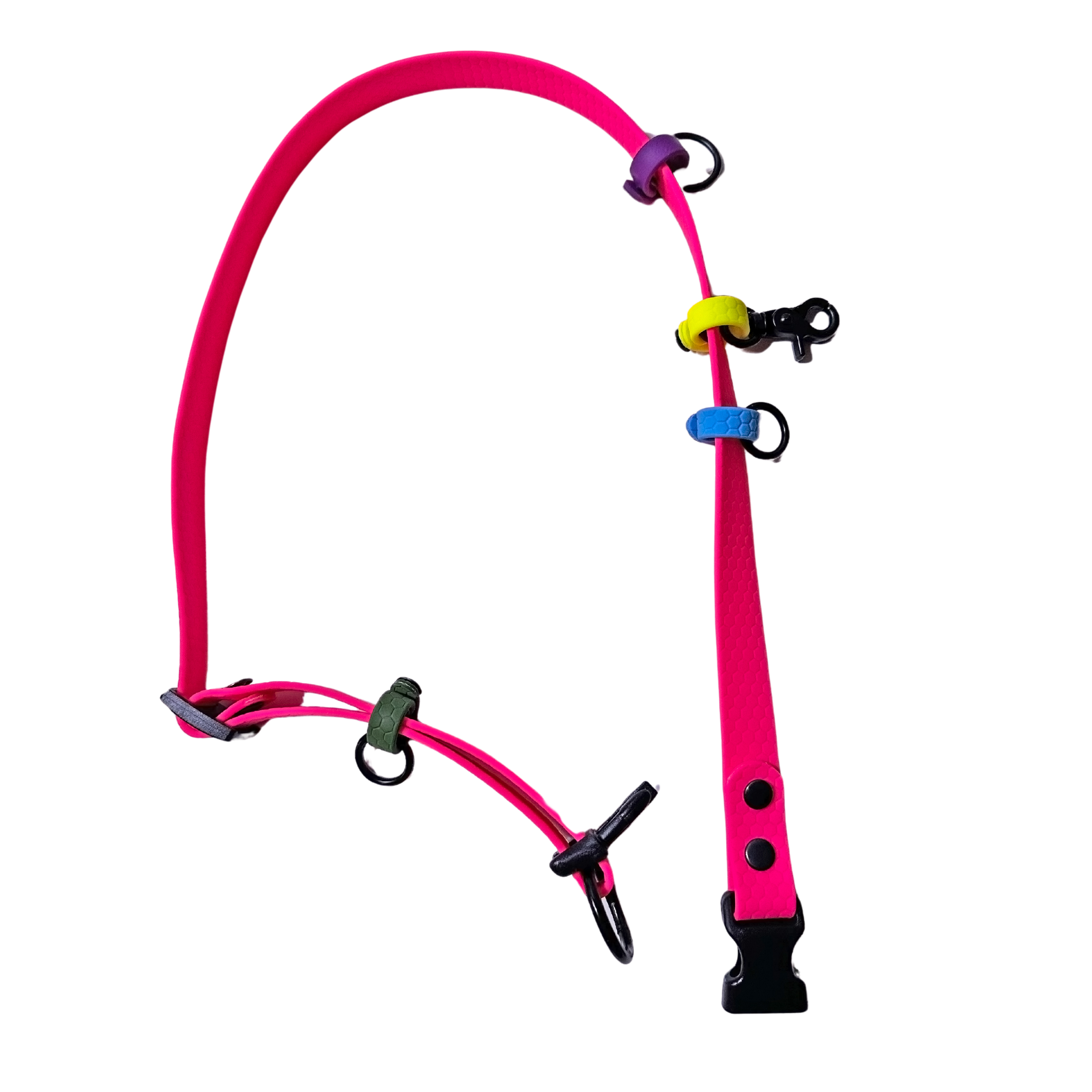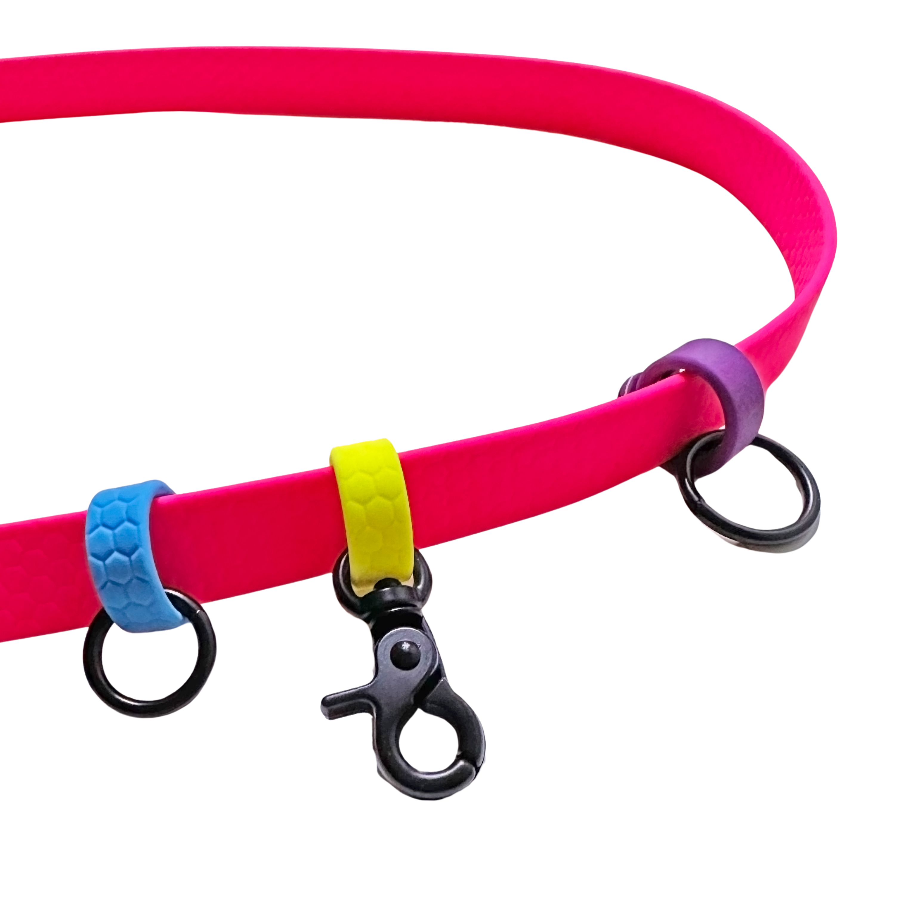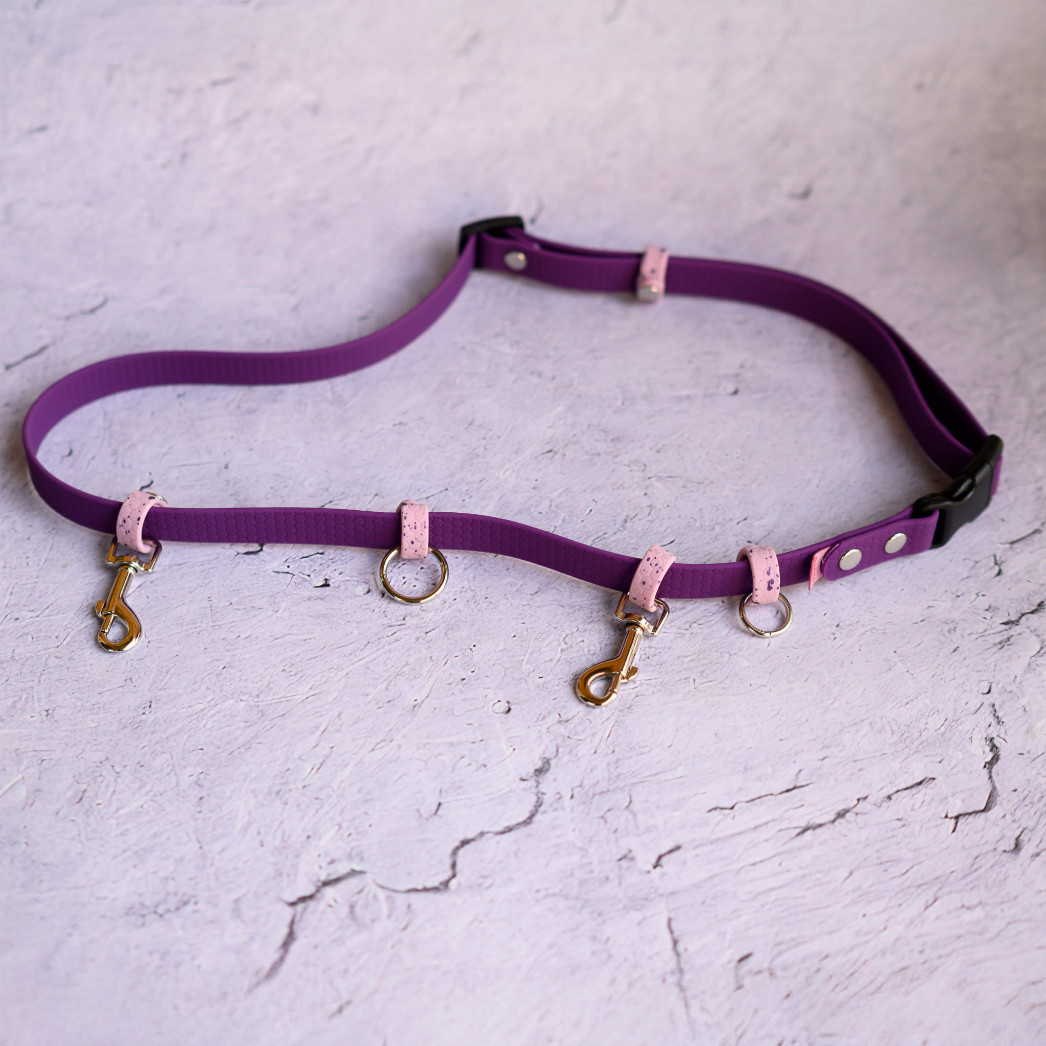 Pas spacerowy może być noszony albo przez ramię, albo w pasie. Posiada cztery przypinki- trzy z kółkami, jeden z karabińczykiem, dzięki którym będziemy mieć zawsze pod ręką przydatne akcesoria. Pozwala na podpięcie smyczy przepinanej do kółka przy zatrzasku lub przełożenie przez rączkę w smyczy miejskiej.