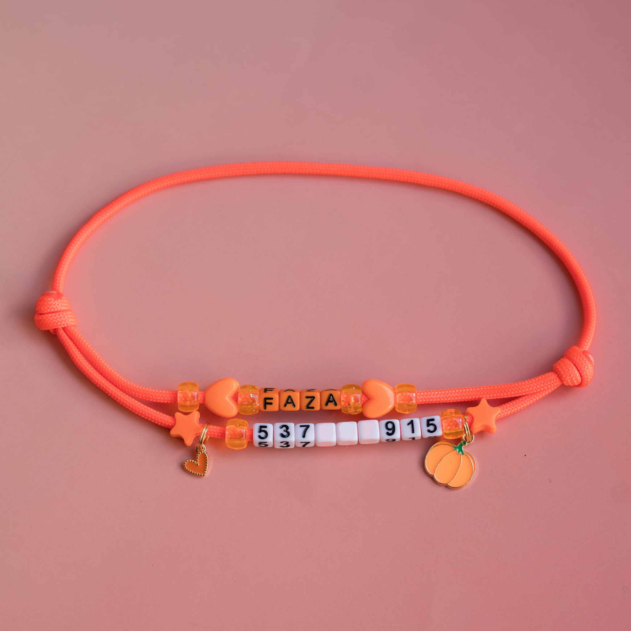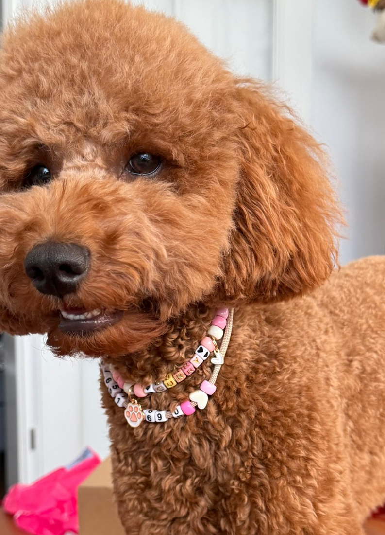 Adresówka dla psiaka z imieniem i numerem telefonu z ozdobnymi koralikami.